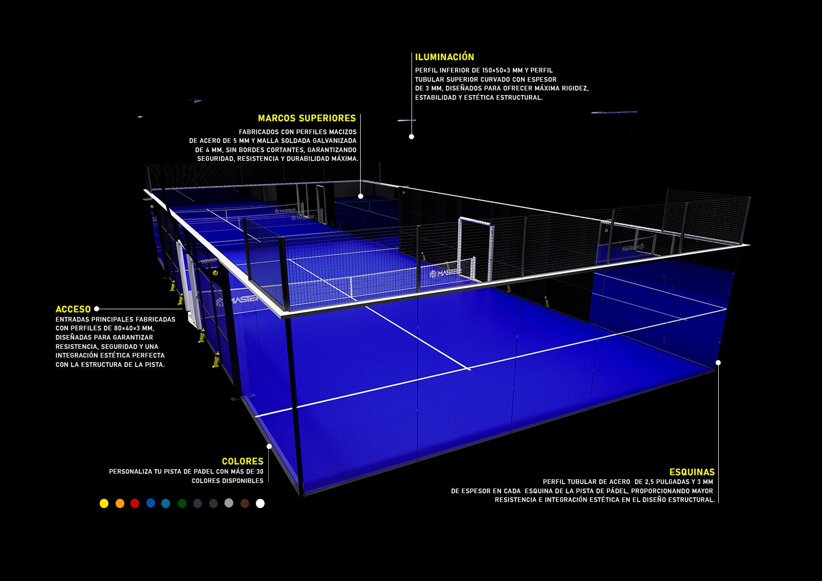 Versión premium y ultrapanorámica de nuestras pistas con esquinas, tubulares, ampliamente utilizada en eventos internacionales A1 PADEL. Todos los elementos de nuestra pista, cumple con todos los parámetros al tope de línea para entregar la mejor pista jamás vista.