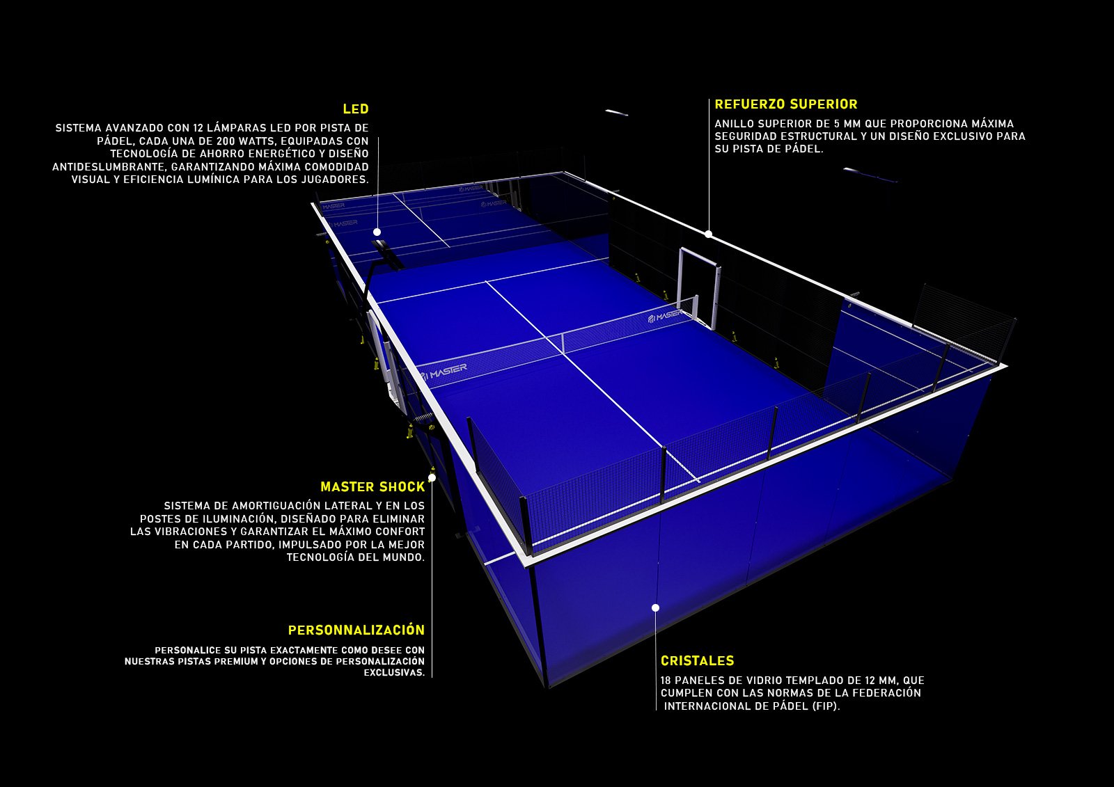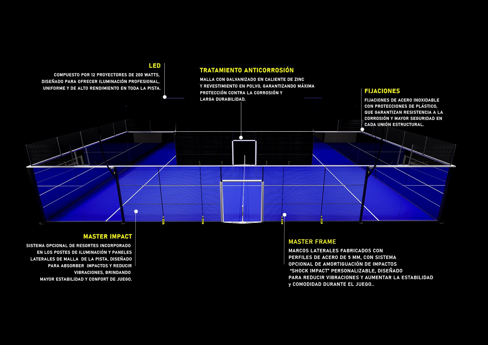 Versión premium y ultrapanorámica de nuestras pistas con esquinas, tubulares, ampliamente utilizada en eventos internacionales A1 PADEL. Todos los elementos de nuestra pista, cumple con todos los parámetros al tope de línea para entregar la mejor pista jamás vista.